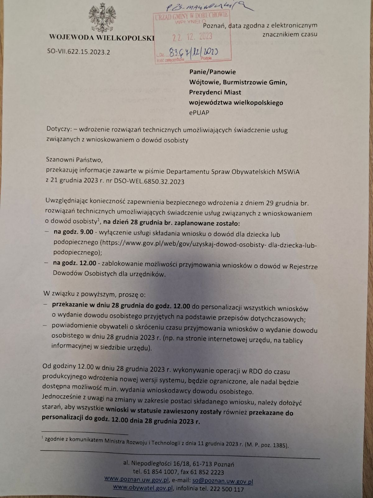 Informacja Wojewody Wielkopolskiego - 28 grudnia przerwa w działaniu Rejestru Dowodów Osobistych
